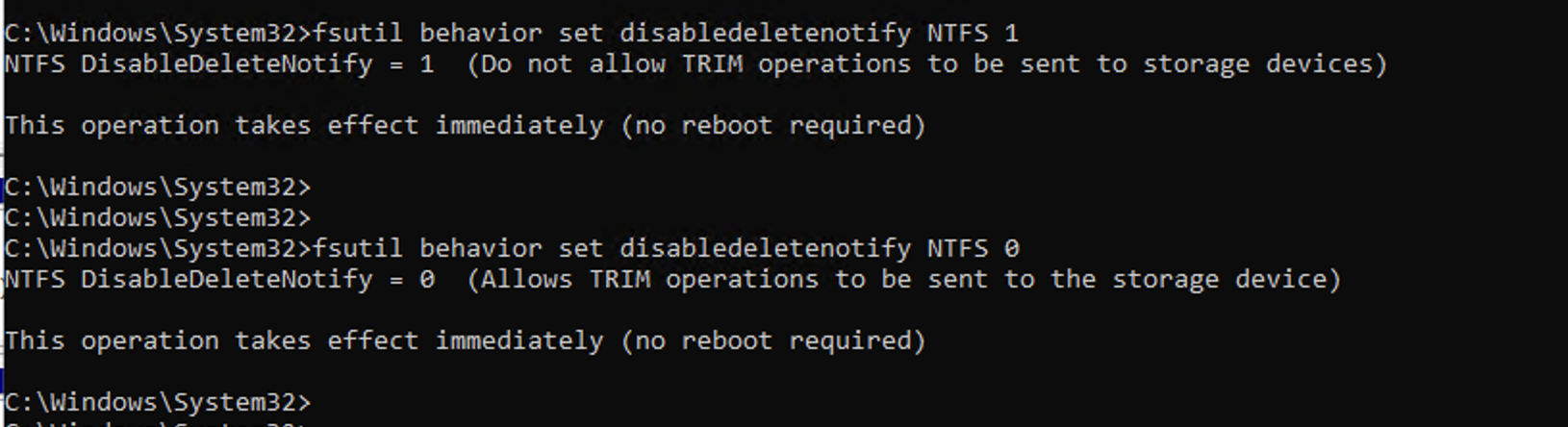 - Check the TRIM/UNMAP status: Run the command fsutil behavior query disabledeletenotify to see if the setting is enabled (result of 0 means enabled) or disabled (result of 1 means disabled).