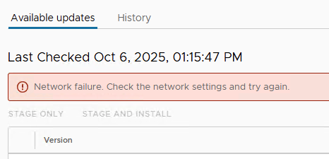 this was the second time I faced this problem, that vcenter vami update failed with the message „Network Failure. Check the network settings and try again“ , but when i tried ping to broadcom website from the vcsa cli the ping was successfull. but when I tried to verify that vcenter had internet access, everything was fine and the wget https://dl.broadcom.com/<Download Token>/PROD/COMP/VCENTER/vmw/8d167796-34d5-4899-be0a-6daade4005a3/8.0.3.00400/manifest/manifest-latest.xml command passed